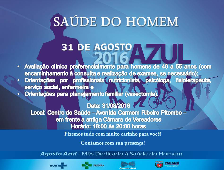 O Dia do Homem em Ubiratã será nesta quinta-feira, dia 31 de agosto, no Centro de Saúde, localizado na Avenida Carmem Ribeiro Pitombo – em frente à antiga Câmara de Vereadores, das 18:00 às 20:00 horas.